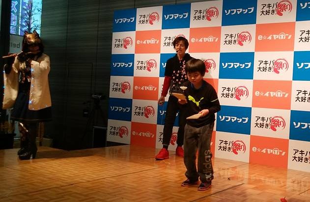初日のオープニング。各ブースの人たちがステージ上で挨拶を。スピンギアは2日間共アイドルライブの合間を縫って30分間に渡りヨーヨーxけん玉xコマxキューブのショーをしてました。