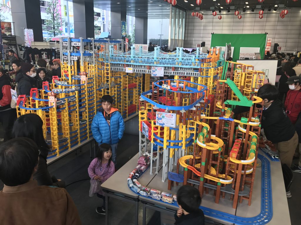入り口は恒例の1畳プラレール。最近は8畳以上のスペースな気もします。今回は真ん中を歩けるということでプラレレールの世界に飛び込める仕様でした。