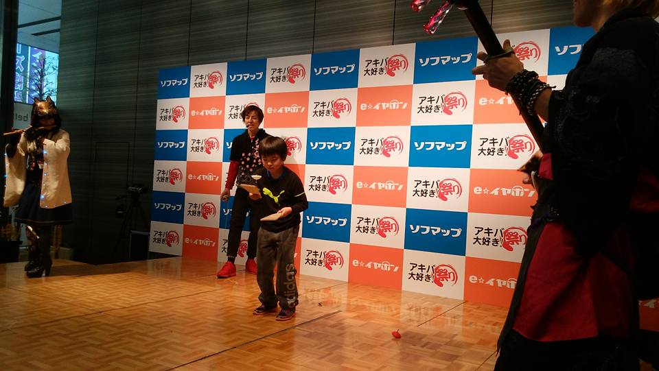 初日のオープニング。各ブースの人たちがステージ上で挨拶を。スピンギアは2日間共アイドルライブの合間を縫って30分間に渡りヨーヨーxけん玉xコマxキューブのショーをしてました。