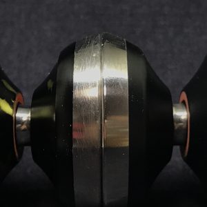 ヘイメーカーもせっかくなのでプロトタイプ、製品版、66ヘイメーカーと並べてとってみました。Exit8→オービタルという譜系は狙われて作られているものですが、ダンカン初のバイメタル、ヘイメーカーはすこし悲しいことに、ダンカンのお膝元とも言えるクリーブランドで世界大会をやるにあたってそのタイミングで発売できる新作メタルがオリガミとBarracudaしか無かったために、急遽追加されたという事実があります。先行販売の形だったのでロゴマークもなく、ヘイメーカーという名前の由来もはっきりしないまま発売されています。オービタルが調整を必要として時間がかかったのに対し、ヘイメーカーはシグネチャーモデルではなかったため、特に仕様変更に制限もなく、幅を狭くしてブレの可能性を少なくして発売したという流れが正しいようです。