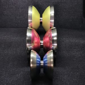 また忘れてはいけないヨーヨー界にタケシが残した功績は”タケシレセス”の存在です。当時、ヨーヨーの上にパッドを張り、レスポンスとするのが当たり前だった時代に、本体に溝を掘り、パッド分オフセットすることでストリングの摩擦を減らし、滑りを良くしつつ、ヨーヨーの戻りには影響がないという構造を確立しました。これは現在のメタル機種ほぼ全てに採用されているパッドの仕組みの原型にあたり、この仕組無しには競技ヨーヨーの世界の発展が数年遅れていた可能性もある大発明です。