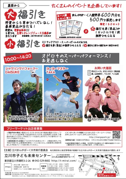 今週末のスピンギアは? 2017年3月30日 イベント告知 by TAKA. 1日土曜日は西八王子店を久しぶりに営業する予定です。 4月1日西八王子店営業日です。 12:00-18:00までの営業です。 ご来店お待ちしております。 4月2日はスピンジャムを13時から地下1Fのスタジオで開催。天井が高いのでオフストリングも余裕です! そしてその日はまんがパーク大市のステージでTAKAがパフォーマンスをしています。 ぜひあそびにきてくださーい! 前の記事 次の記事
