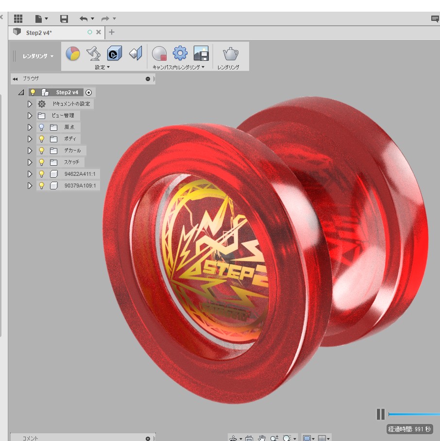 ステップ2の場合、6角ボルトの部分があり、旋盤のみの加工では難しいこと、フライス盤などを併用すれば削りだしでも作れるのですが、純粋に3Dで図面を作って、それを出力したらヨーヨーとしてきちんと使えるのかということを試してみたく、商業用の3D出力サービスを使い、試作をしました。