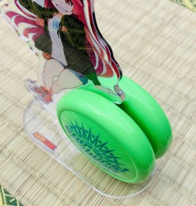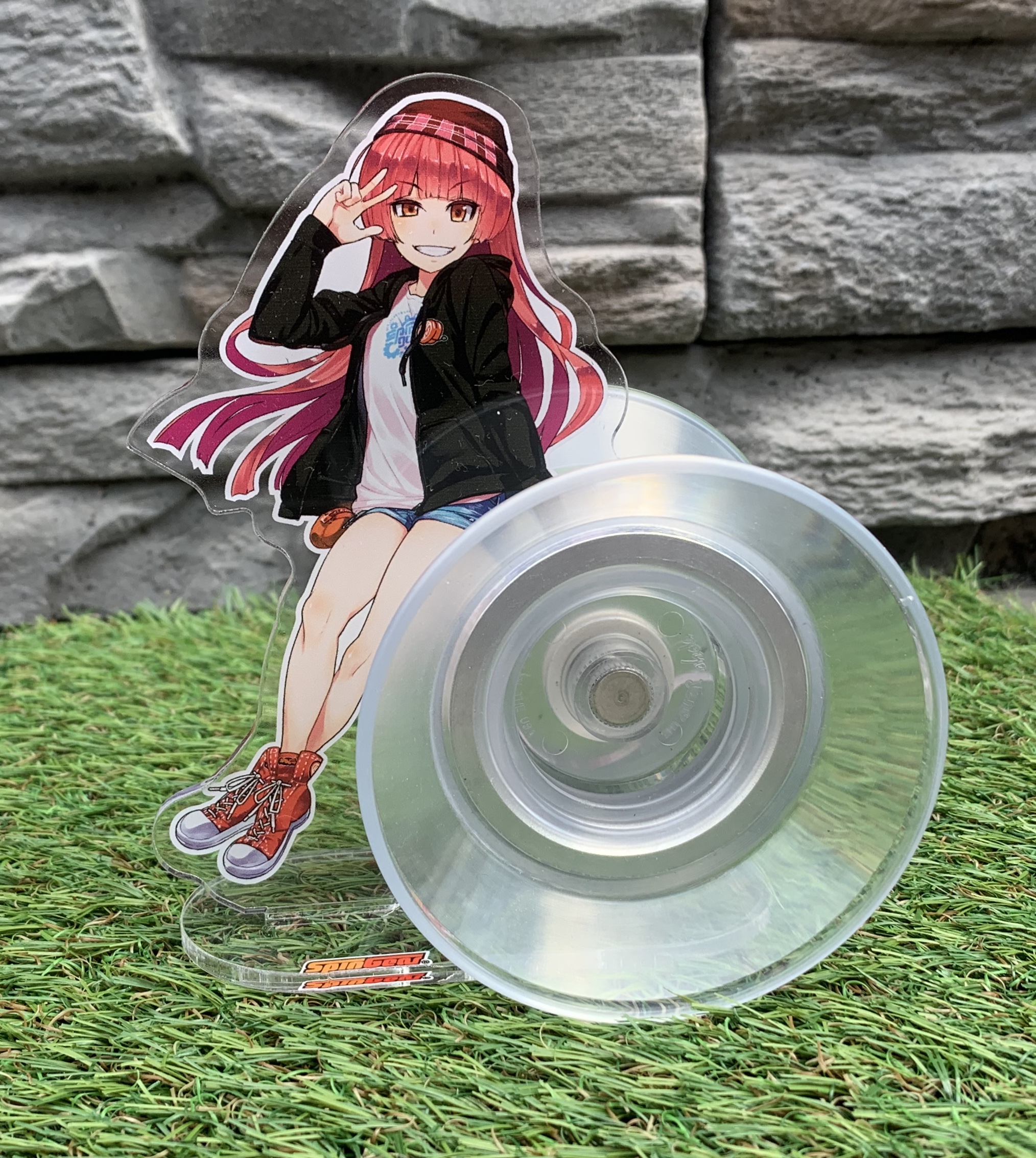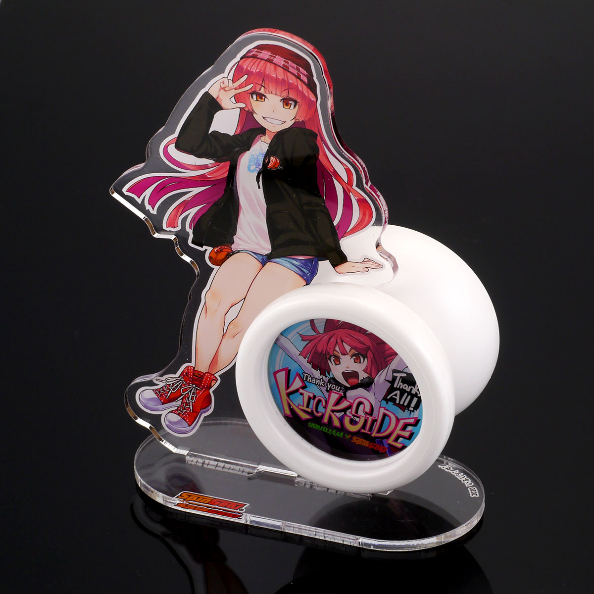 やりたいからやったシリーズです。アクリルフィギュアという新しいカテゴリーが生まれていて、去年、中国の工場でアクリル工場の視察をしてきたときに種類とアイテムの多さに驚き、ヨーヨーでもやってみたい、と思っていたところいふじ先生にご快諾いただき実現。国内生産の精密印刷&仕上げとなっています。キックサイドも当時のデッドストックですが、キャップはPET素材にUV印刷という最終進化系。こだわりにこだわったつくりとなっています。