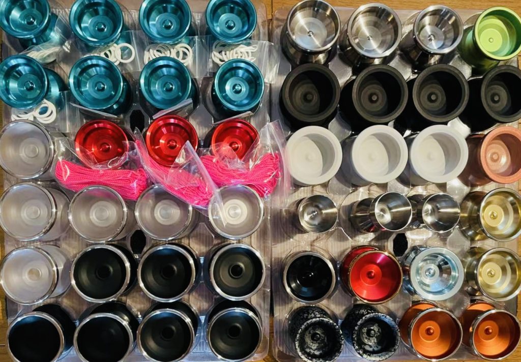 この中からどれかが当たります!定価1万円超えのヨーヨーが多く、ラディックス(マグネシウム、3万7千円)も8/48個と超高確率で入っています。ポリカ削り出しのリムヨーヨーも13000円が定価となっていて、封入率13/48なのでかなりお得です。4/48でチタン(右上の最上段、グリーンも含む,使用に問題のない微ブレ品)となっていて過去最大規模なんじゃないかと思う豪華さです。ヨーヨーはA品とアウトレットと両方混ざっていますが色ムラのものがメインで、ブレあり品でも微細な振動レベルで、ブレが酷くて遊べないようなものはないのでご安心ください。