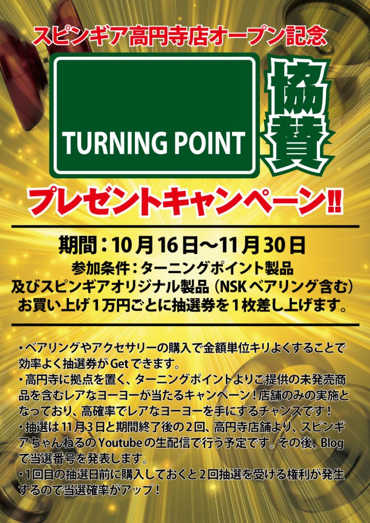 ターニングポイント協賛プレゼントキャンペーン=1万円ごとの購入で抽選券がもらえるキャンペーン。17個もあたりがあるのでかなりの確率で当たります。先週末で30番代まで出ています。現時点での当選確率は50%超え(実際には2回抽選となるため厳密な当選確率は異なります)。11月3日の1回目の抽選までにチケットをゲットしておくと2回抽選に参加できるので当選確率は更にアップ!