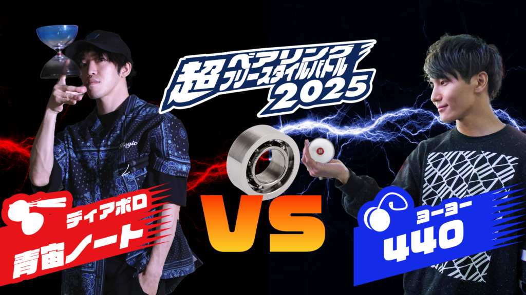 第一バトルはディアボロ・青宙ノート VS ヨーヨーパフォーマー440。ベアリングではお馴染みのイクイップメント同士の対決。ただ一癖も二癖もあるベアリング使用をしているとの噂もあり、目が離せません!
