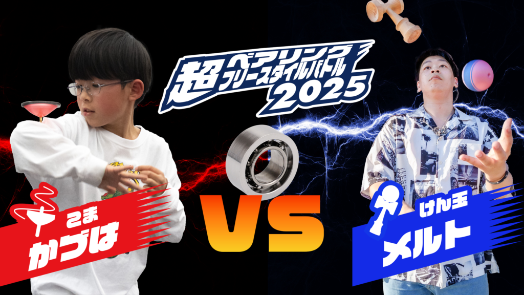 第二バトルはこま・たにかんた VS ペン回しパフォーマーKay。こまとペン回しの世界チャンピオン同士の対決は前代未聞。こまもペン回しもベアリングを余り使わない分野だけにどのようなベアリングと通常の道具の使い分けがあるのか楽しみ