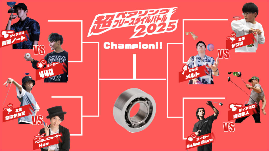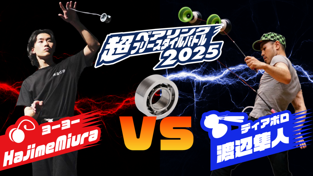第四バトルはヨーヨー・Hajime Miura VS ディアボロ・渡辺隼人。両者とも世界王者にして複数の道具を使いこなすチャンピオン。ベアリング使用数はダントツで多いバトルになりそうです。