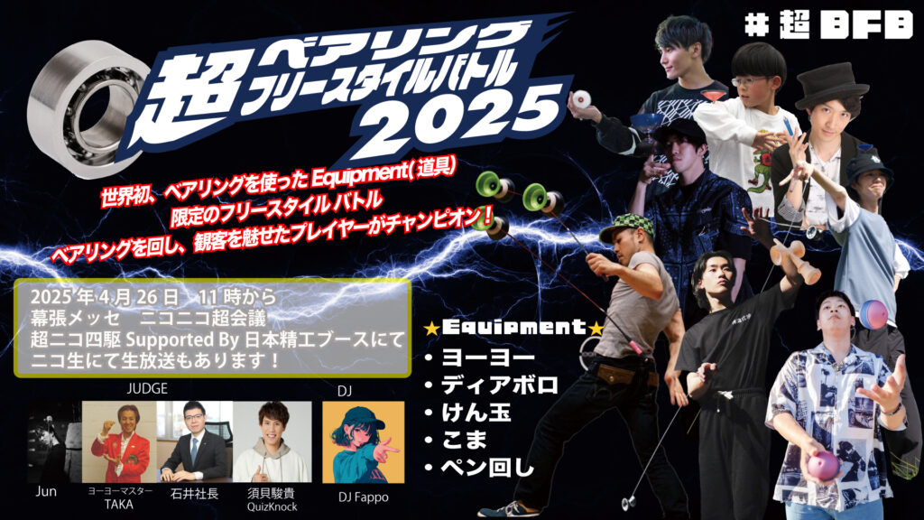 ホビーの世界では、ベアリングがあることであたらしいうごきが生まれ、道具として魅力が増すものが気がつけばたくさんあります。スキルトイという括りだったり、昔遊び、大道芸人の道具、おもちゃ。など色々カテゴリーする方法はありますが、ベアリングを使っている道具で競う、という括りのカテゴリーは実は今までありませんでした。