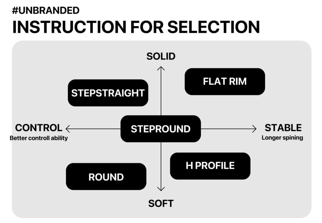 STEPSTRAIGHTFULLSIZEは、#UNBRANDED のラインナップの中でも、コントロールがしやすく、かつカチッとしたソリッドな使い心地に位置します。このポジショニングが表すように、このモデルはいつまでも回り続ける安定感よりも、プレイヤーの意思通りに動く操作性を優先しています。